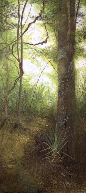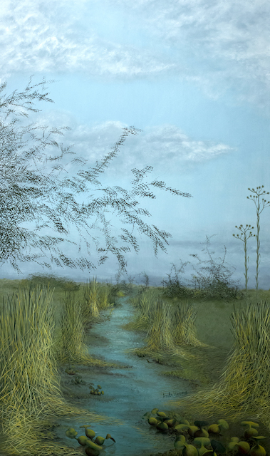 Sus pinturas al óleo en gran formato nos transportan a “lugares soñados”.