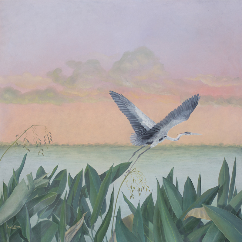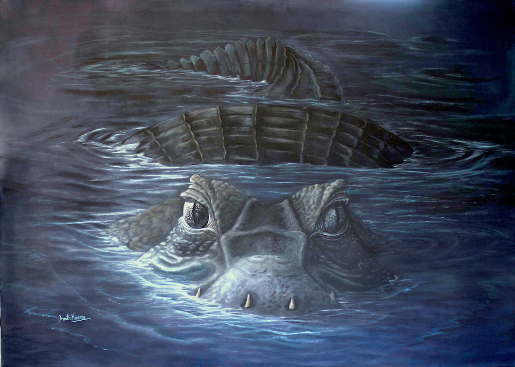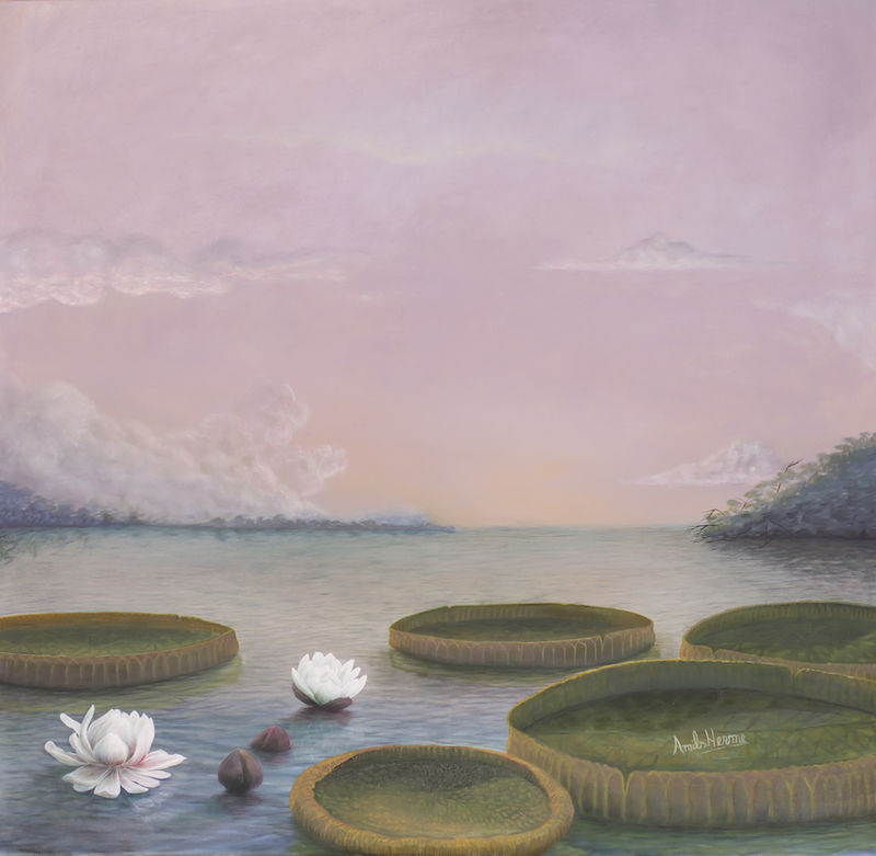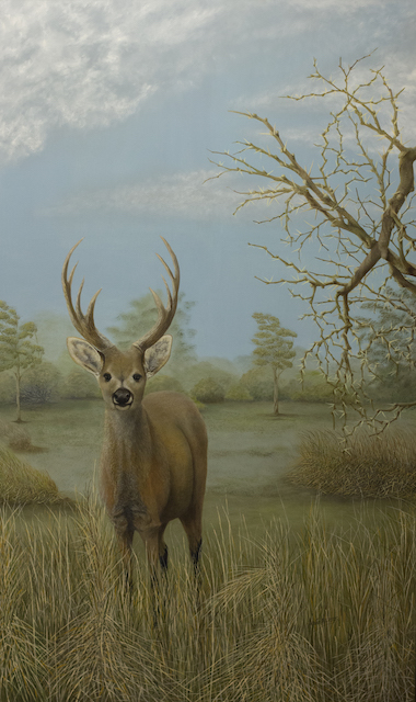 Sobre un cielo de fondo, el horizonte representa la inmensidad del paisaje mientras en los primeros planos se recorta la vegetación autóctona de gran belleza. Aves, cocodrilos o ciervos completan la escena creando una atmósfera de libertad casi onírica.