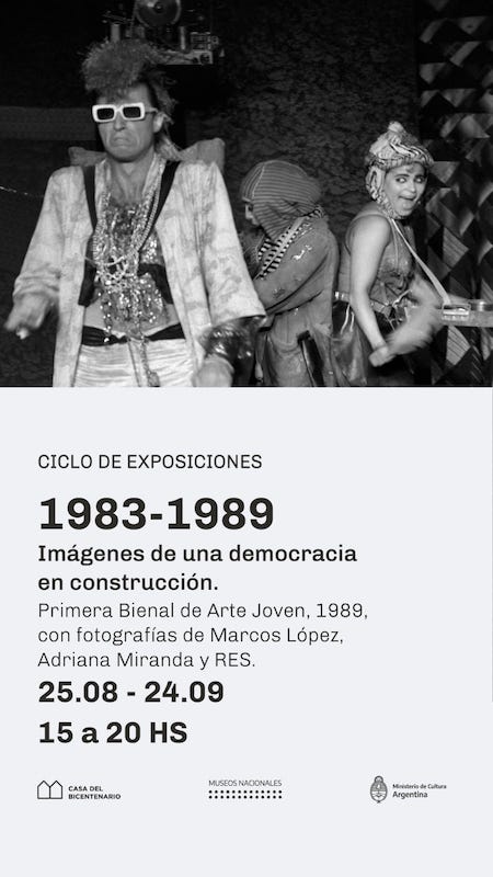 En el marco del ciclo de exposiciones 1983 -1989. Imágenes de una democracia en construcción, la Casa Nacional del Bicentenario presenta: Primera Bienal de Arte Joven, 1989, con fotografías de Marcos López, Adriana Miranda y RES.