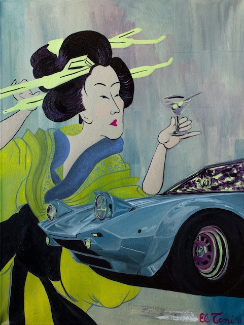 Apelando a su pasado de bartender, El Toni -como lo identifican sus colegas- es capaz de combinar distintas culturas en un cocktail donde un auto Italiano puede reunirse con una Geisha Japonesa o un dragón con una pizza y es ahí donde el Ukiyo-e se funde con el impresionismo en la obra de este artista boliviano.