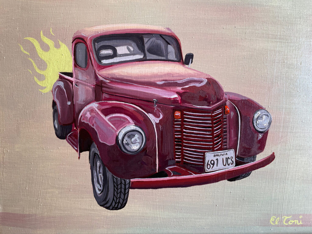 Tras experimentar diversas técnicas y materiales, Toni se especializa en la representación de motos y autos antiguos. Una temática que le es familiar, desde el conocimiento adquirido a través de su padre coleccionista en ese rubro.