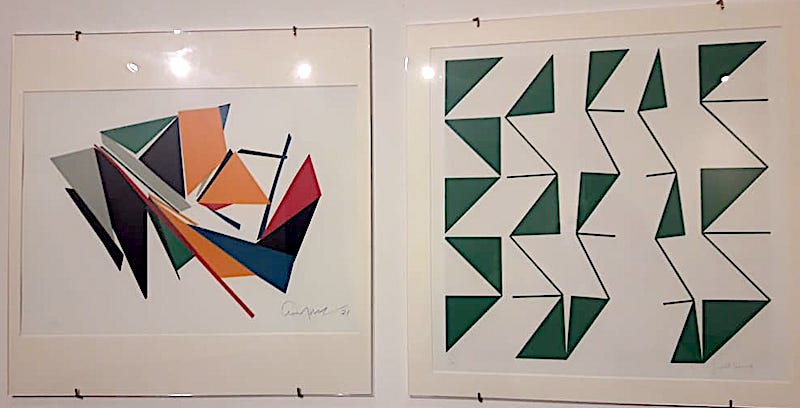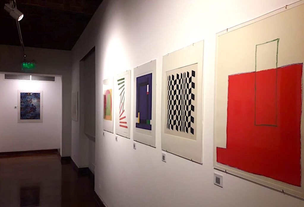 Luiz Dolino, artista carioca que ha expuesto en destacadas galerías argentinas, es parte de esta muestra en la que participa su maestro, el geométrico bauhasiano Eduardo Sued, Ingeniero y diseñador del Arquitecto Oscar Niemeyer. Dolino, durante el recogimiento interior de la pandemia COVID 19, comienza a realizar grabados estimulado por Papel Assinado. Su geometría colorida y aterciopelada, se engarza en el “collar» de selectos grabados enmarcados de menor formato que acompañan la curvatura del salón, del lado izquierdo, con los abstractos -lenguaje que en el grabado comienza a partir de los años 50-donde resaltan obras de enorme calidad gráfica. A la derecha, siguen las figurativas.