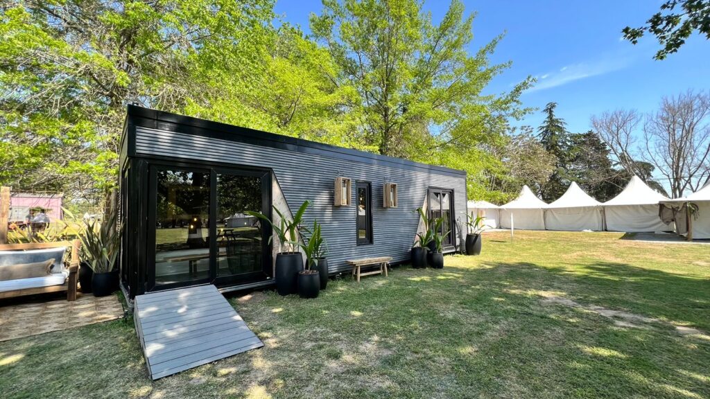 Y por último el espacio Tiny House – Esos Momentos de Laura Astargo y Nora Rotuno que ofrecen un diálogo entre lo autóctono-tradicional-moderno, y campo-ciudad. «Un lugar donde campo y ciudad dialoguen y se potencien. Así es que proyectamos este dormitorio imaginando un huésped que busca desconectarse de los trajines urbanos para poder conectar con la naturaleza, la familia, los amigos… un huésped que disfrute de «esos momentos» que le ofrece la vida. La elección de la paleta de colores, acabados, formas, materialidades, utilizando maderas y cuero como protagonistas, y apelando a muebles bajos, que impactan positivamente en el sentido de la relajación buscada, surgen de imaginar a un huésped que disfruta de lo autóctono, pero sin dejar de lado la sofisticación y las comodidades a la que estamos acostumbrados quienes vivimos en la ciudad».
