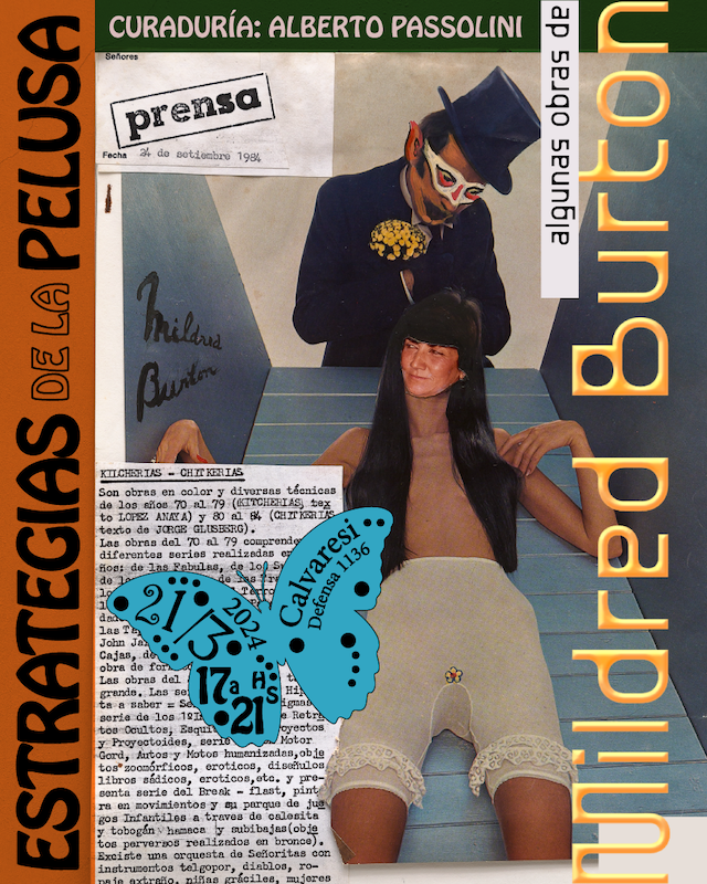 25 pinturas, tres libros y una archivo de prensa enmarcado dan cuenta de la muestra curada por Alberto Passolini, amigo entrañable de la artista. Este nos acerca a su intimidad contándonos cómo se conocieron; a la vez que despliega parte de la trayectoria de Burton. Nos confía su apodo familiar “pelusa” y cómo encuentra en él los rasgos principales del proceso de creación de Mildred.