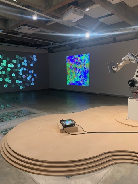 “De lo que se trata – más allá de ese vínculo, si se quiere emocional y seductor de las máquinas que producen una cierta danza en el espacio invitando a la participación – es de un sistema impersonal, industrial, autónomo; de control y de cuidado al mismo tiempo que aprende en función de la intervención de las personas. Se trata de nuestro vínculo con los algoritmos y con la automatización de un ente, de un sistema que es capaz de estudiar y memorizar de manera independiente”, explica Sardón. Ese análisis pormenorizado basado en cálculos matemáticos se proyecta sobre una segunda pared como un cuadro rico en timbres cromáticos, adyacente a la primera, y en ese contraste entre el collage fotográfico y la imagen abstracta, que remite a la tradición científica, la relación humanidad-tecnología instaura un diálogo y desencadena una multiplicidad de interrogantes.