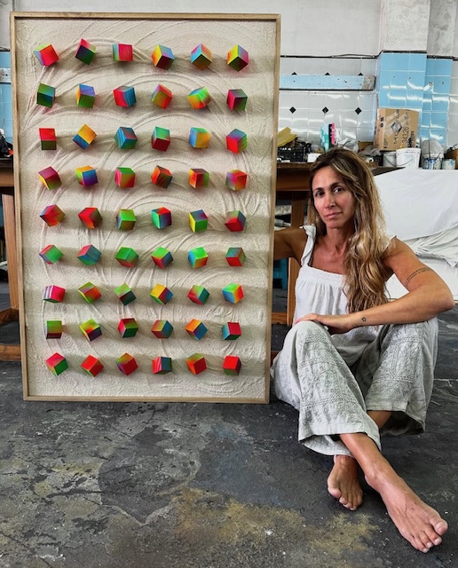 La artista, conocida por sus creaciones abstractas, utiliza arena de cuarzo, madera, telas y plásticos para evocar emociones viscerales en los observadores. Cada texto, forma y espacio en sus obras se convierte en una metáfora de la experiencia humana, invitando a los espectadores a reflexionar sobre la conexión entre lo tangible y lo intangible.